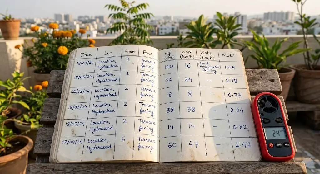That afternoon I borrowed Suresh’s hand anemometer and measured wind speed at pot height not ambient, not the weather station reading, but actual wind speed at the level of my plants. The reading was 28 km/h at 2 PM, on a day when the local weather station showed 14 km/h. My 4th-floor terrace, unobstructed to the south-west for 400 metres, was doubling the ambient wind speed at pot height.